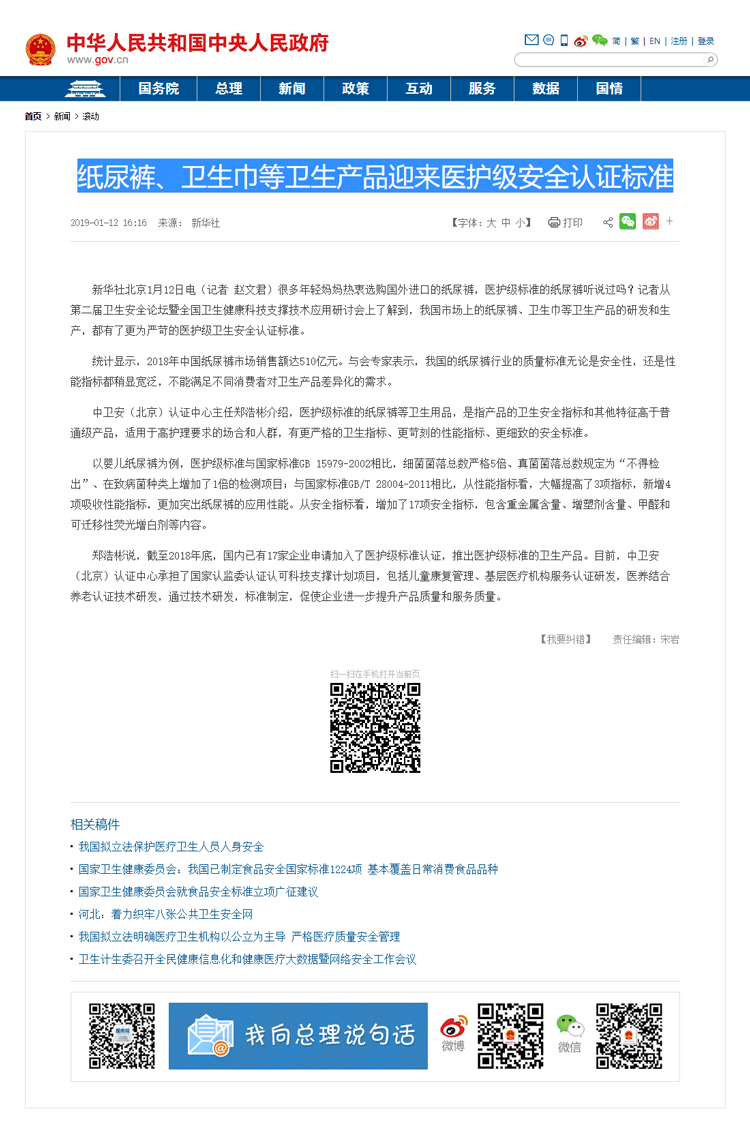 中国政府网报道纸尿裤、卫生巾等卫生产品迎来医护级安全认证标准